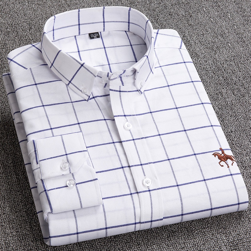 Casual 100% Algodão Oxford Xadrez Bordado Manga Longa